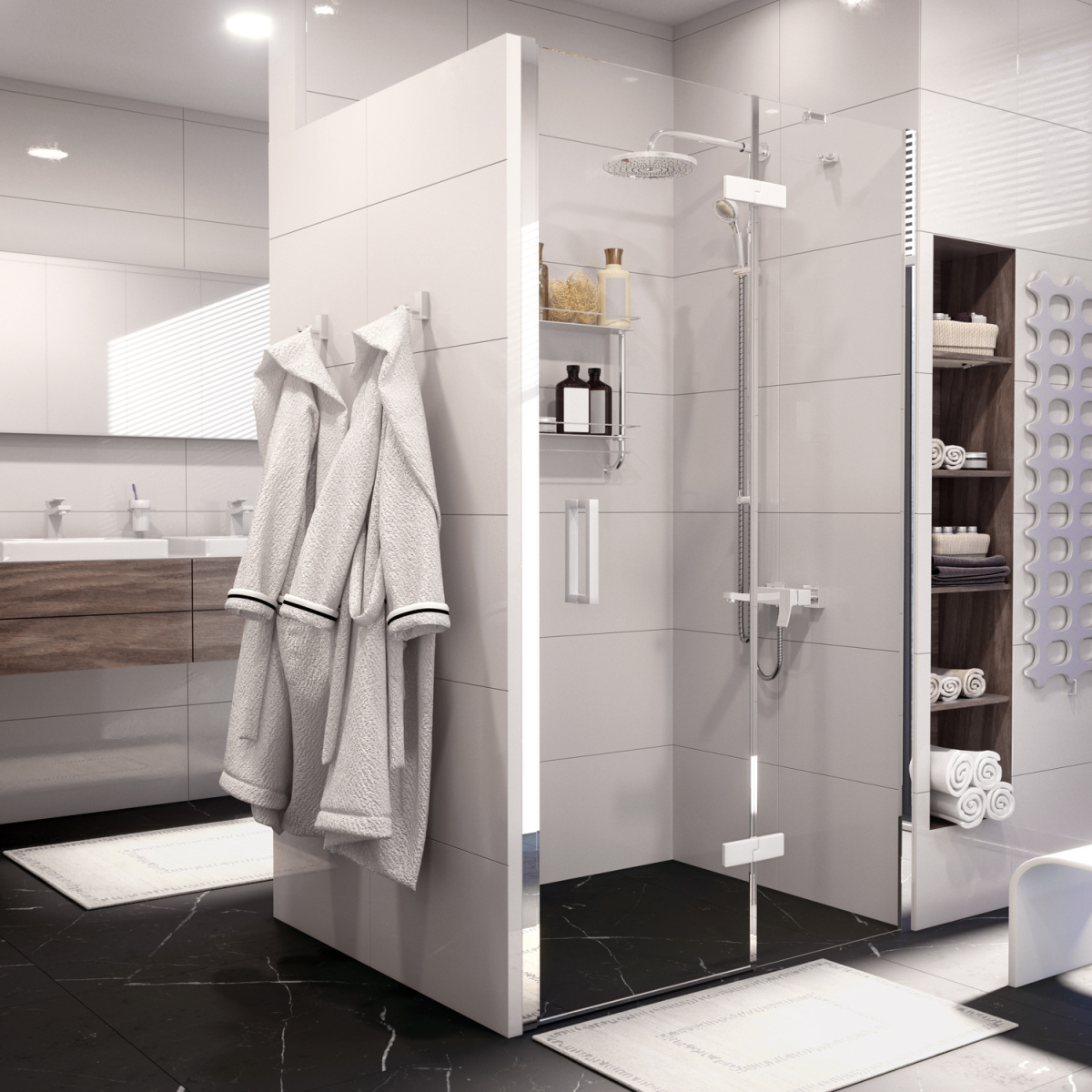 С внутренней стороны душевого уголка петли установлены заподлицо. Это делает уход за поверхностью душевого уголка простым и доступным.